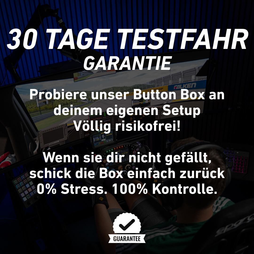 Mit der 30-Tage-Testfahrt-Garantie können Sie die Box innerhalb von 30 Tagen nach Erhalt zurückschicken. Wenn Sie noch unsicher sind, aber die Button Box testen wollen, können Sie das tun.